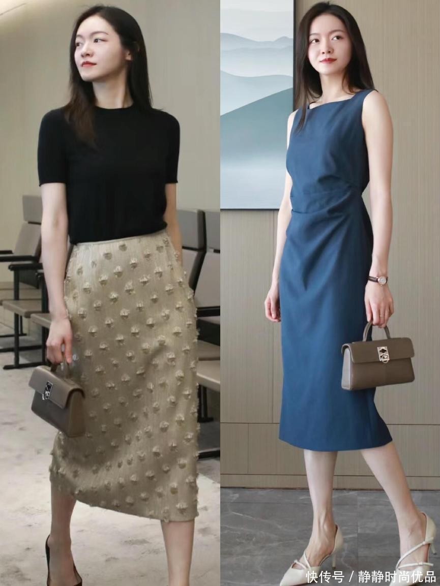 这个时候搭配裙子更好看,不过为了能够保持通勤造型的质感,裙子的长度也有考究,那就是最好选择九分的长裙。