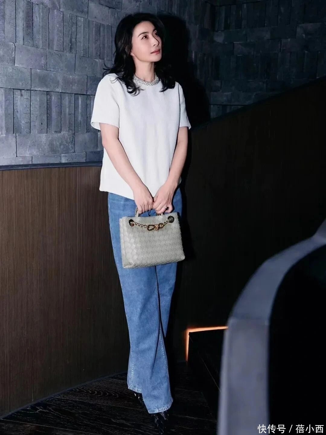下半身,郭晶晶搭配了一条牛仔裤,牛仔裤可以说是白上衣的时髦伴侣,而且就没有它搭配不了的上衣,白色的上衣和牛仔裤搭配在一起,显得整个人更加干净洒脱了。