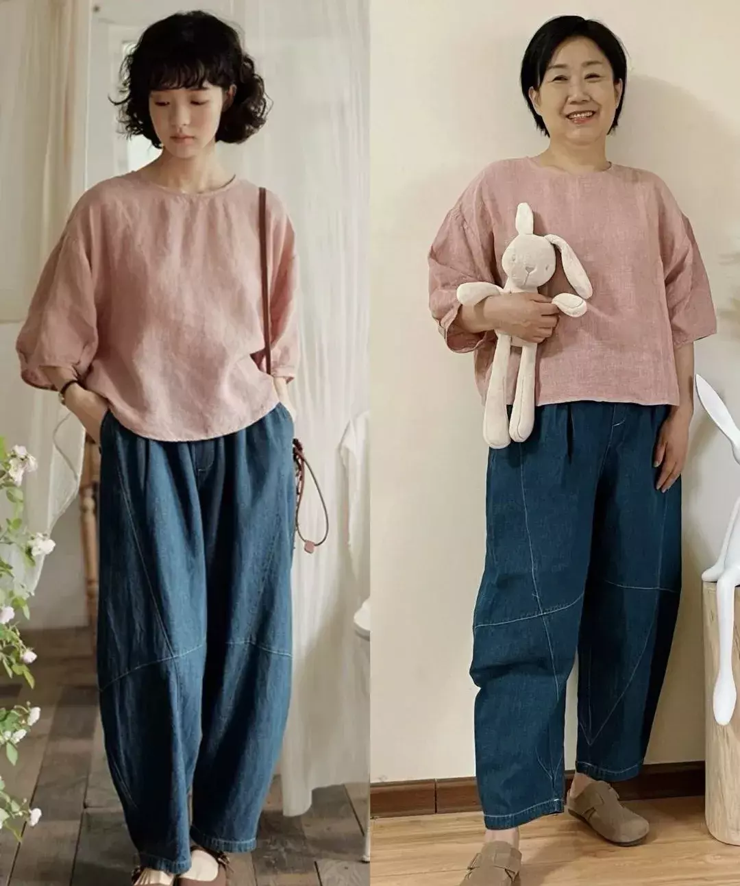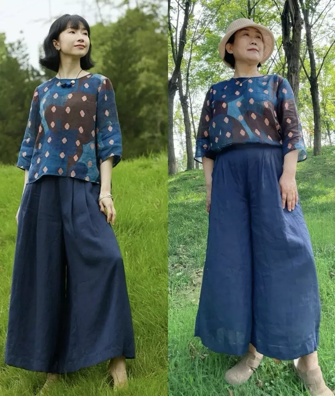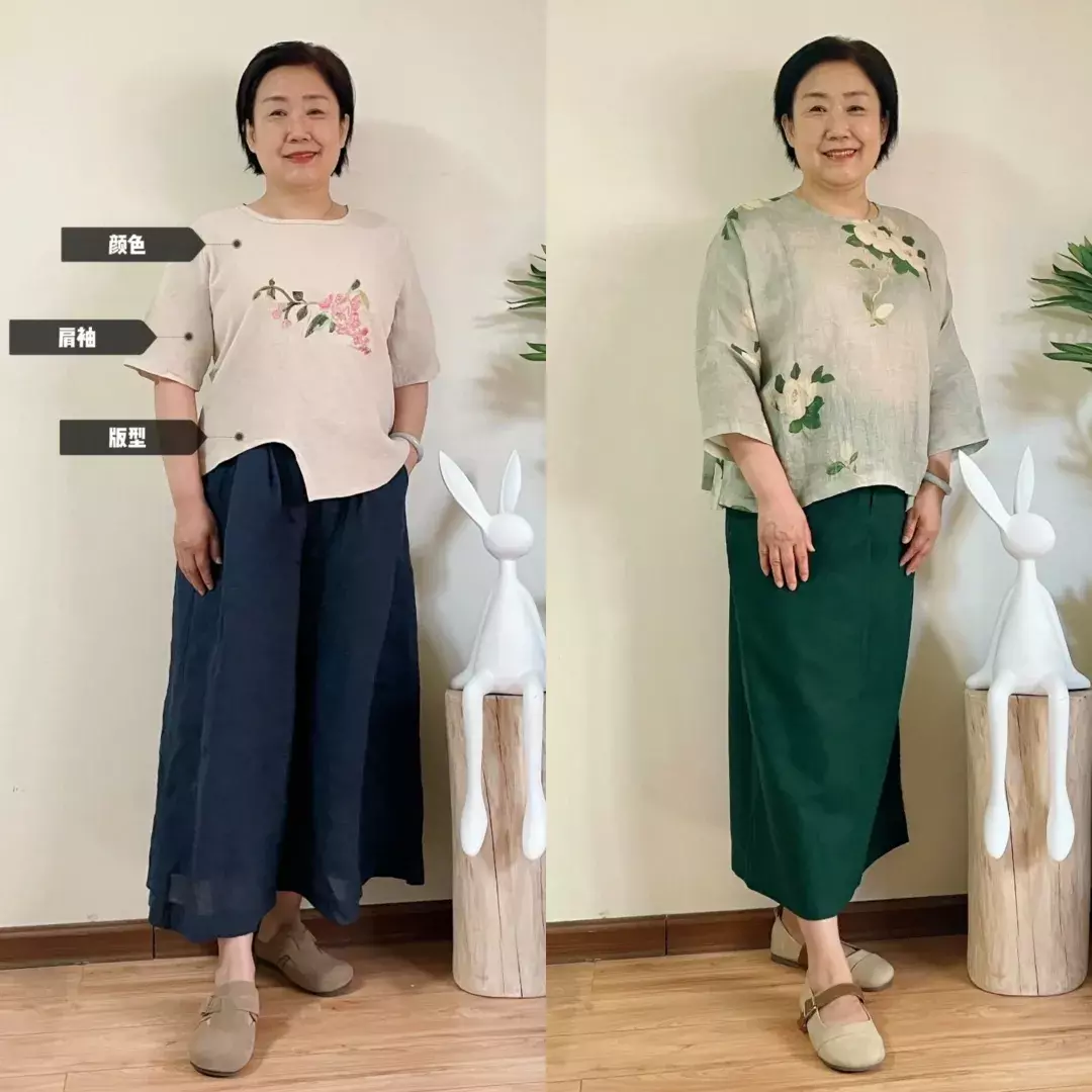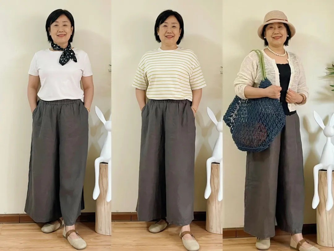 二、一衣多穿就像她说的,这个年纪的女性可能不会像年轻人一样爱买衣服。相比于衣服数量多,她更加在乎性价比和好搭配。就拿她主页出现频率最多的单品,莫过于那条褐色棉麻阔腿裤了。不仅可以搭配白色T恤、条纹短袖、衬衫,还可以搭配背心和小衫。所以说,衣服不需要太多,百搭、舒服就行。一件衣服可以搭配多条裤子;一条裤子可以搭配多件上衣,把一件单品利用到极致,何尝不是成功。