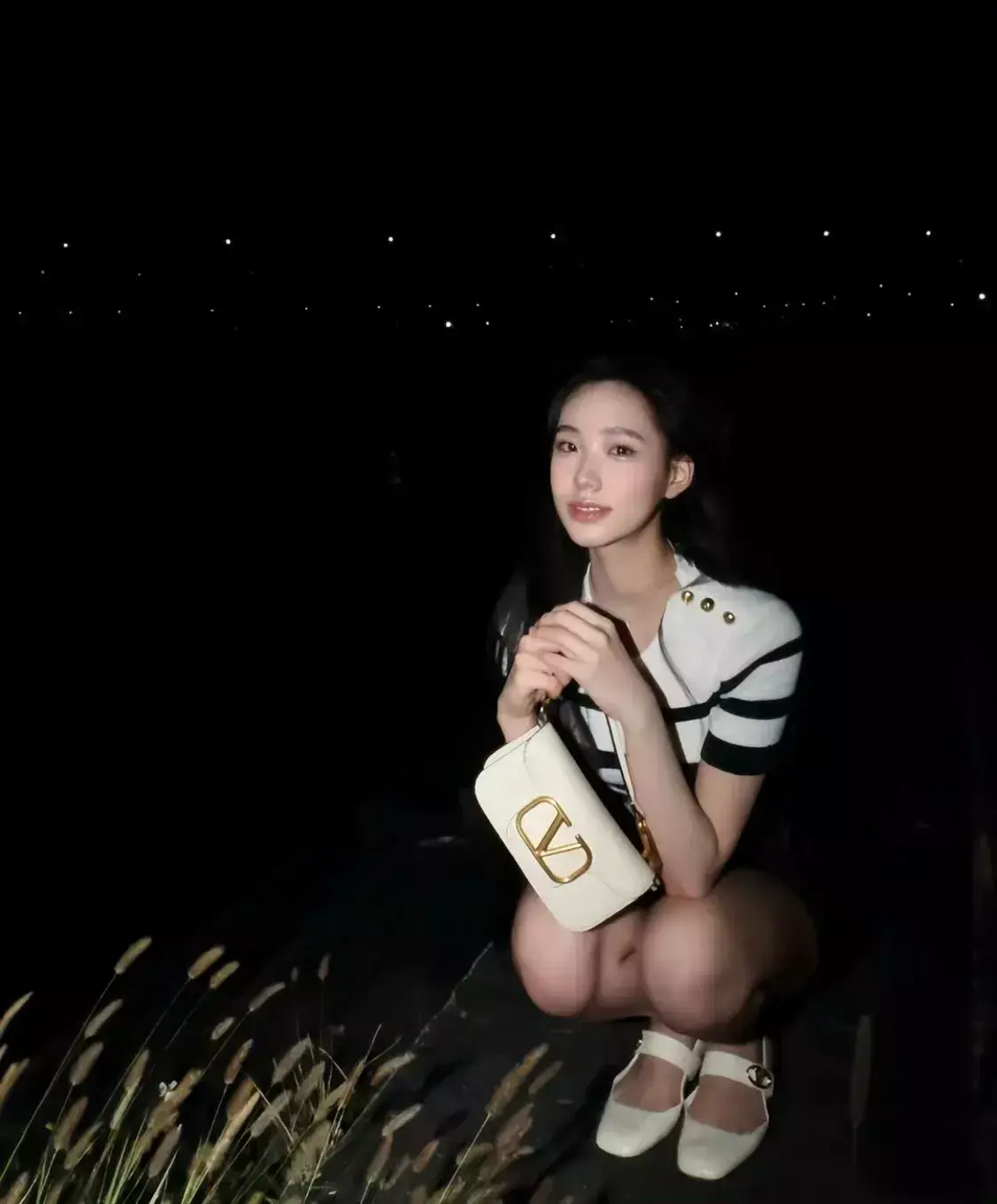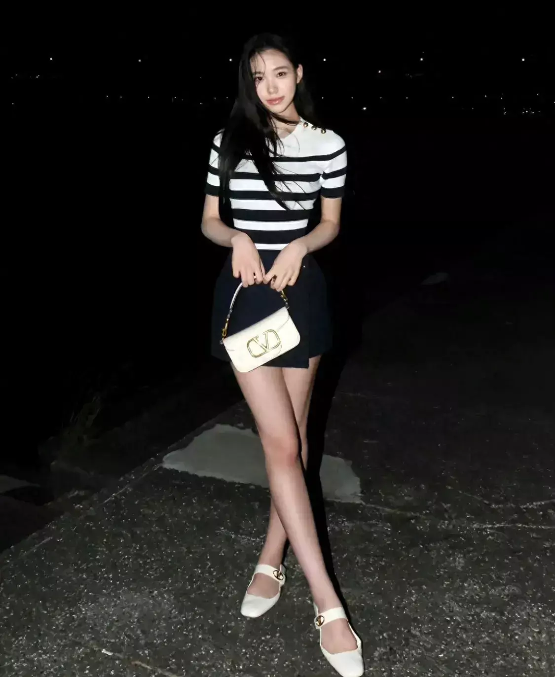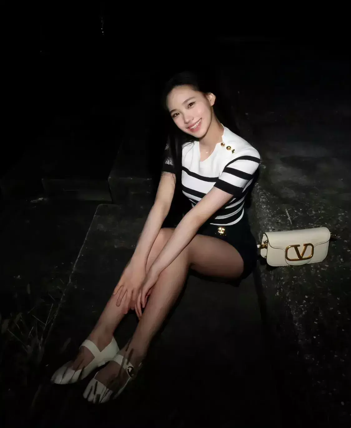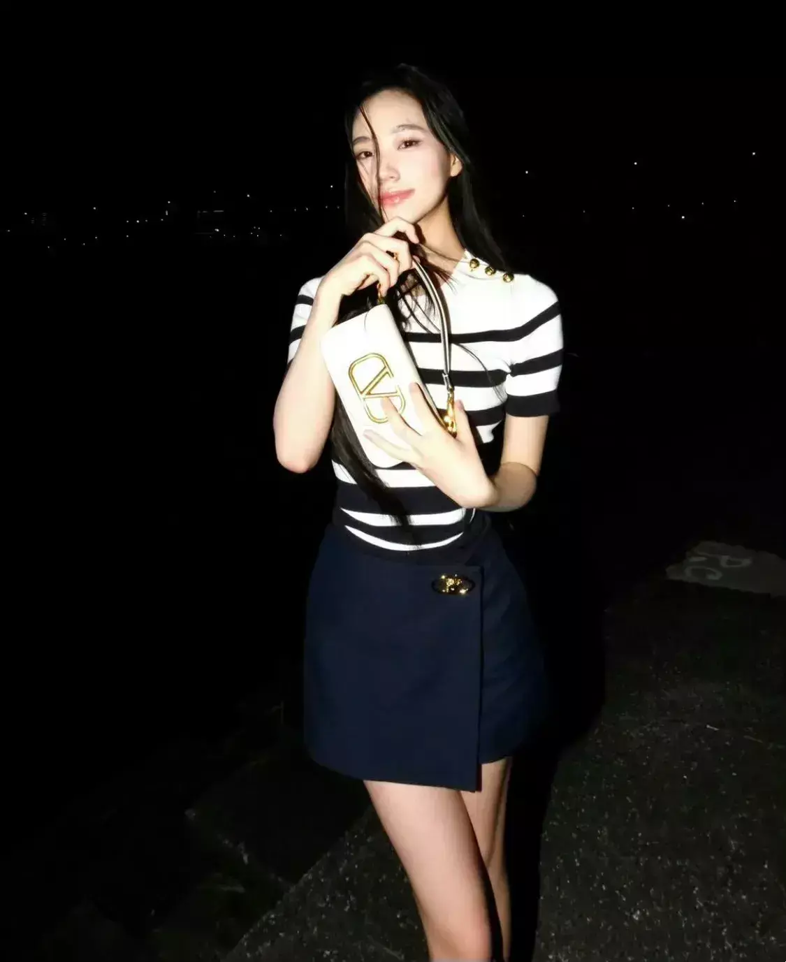 照片中,Lily身穿条纹针织衫,搭配蓝色裙裤,手拎白色单肩包,在夜风中,对着镜头莞尔一笑,发丝飞扬的瞬间,尽显温柔的甜美少女感。