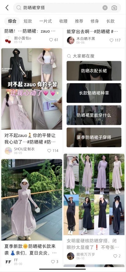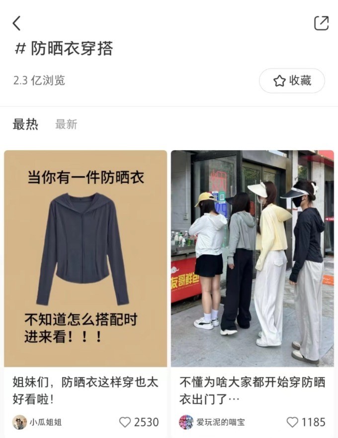 防晒作为夏日的头等大事,今年的防晒服更是向时尚单品靠拢,修身的款式和清新的颜色兼具舒适与潮流。截至目前,#防晒衣穿搭#话题在小红书上已有2.3亿的浏览量。