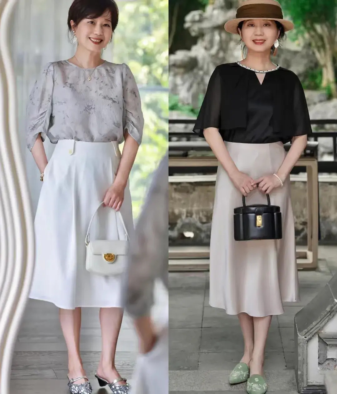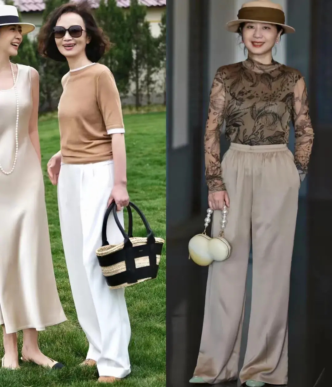 正常来说,如果想要把四五十岁的中年女性的气质呈现出来,首先要入手的就是衣服的品质,例如下面这件衬衫上衣材质上就很好,光泽感好,容易起皱,看上去就显贵。