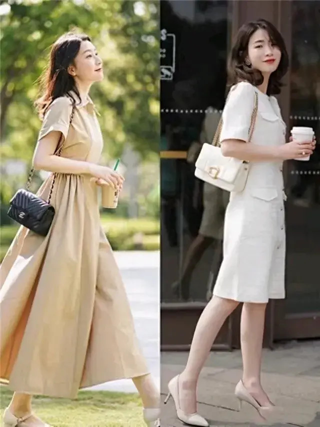 这个夏天也是穿搭裙子最好的季节,一件卡其色的衬衫连衣裙可以和黑色的链条包进行组合搭配,这样的简约搭配就能散发你的气质和魅力。