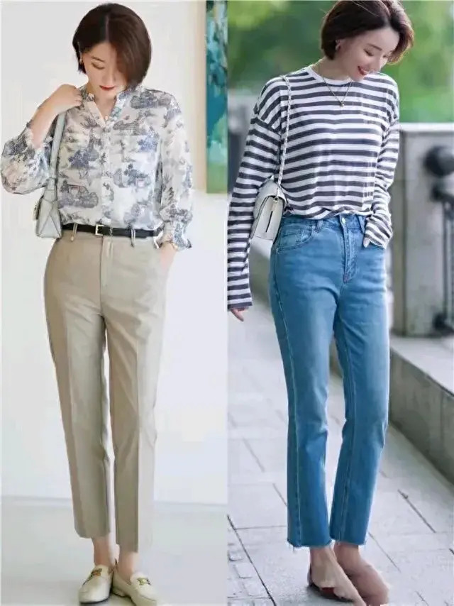 例如下面用一件水墨印花设计的衬衫上衣搭配九分西裤,脚上踩着一款乐福鞋,搭配上米白色的腋下包来点缀,这样的搭配通勤时髦。