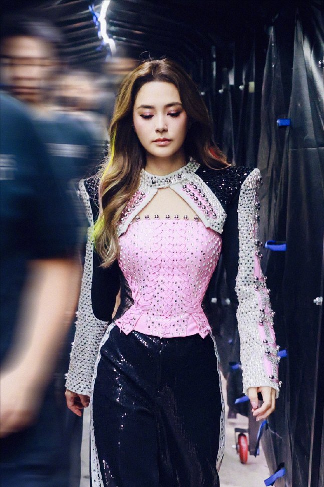 垫肩设计是这套上装的一大亮点。它不仅为阿娇的肩部线条增添了力量感,使得她的整体造型更加挺拔有型,还巧妙地平衡了抹胸部分带来的性感与柔弱感。垫肩设计让阿娇在舞台上显得更加自信与强大,同时也为她增添了一份不容忽视的气场。