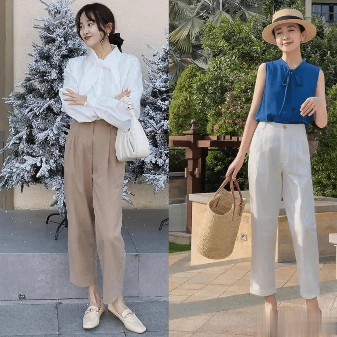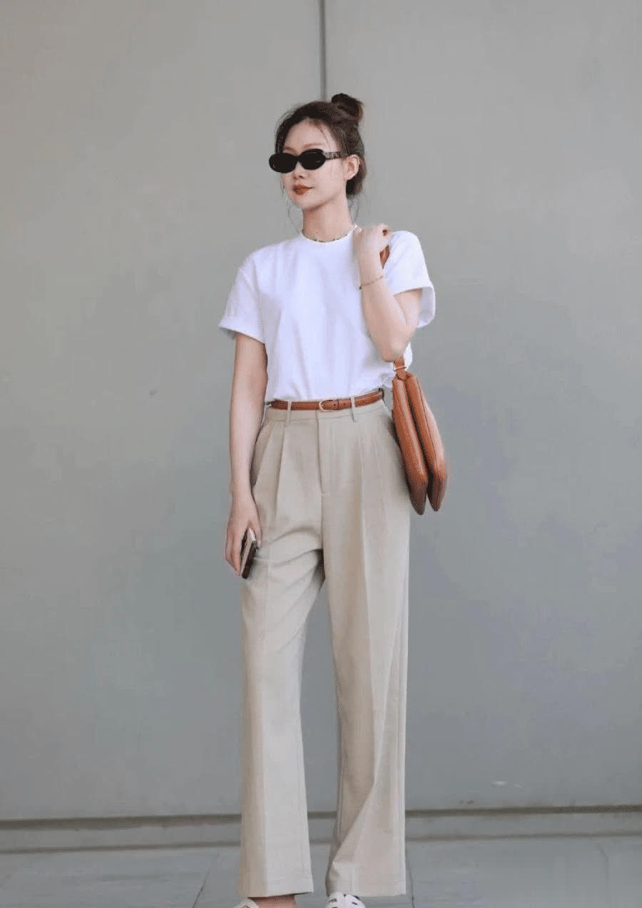 虽然是建议中年女性穿长裤,但是也要注意长度的选择。日常若是更偏向于穿平底没有跟的鞋,那么九分长裤会更适合;而若是选择老爹鞋、高跟鞋等,这些自带跟度的鞋子,就很适合选择十分长度,刚好盖住鞋面的一半,更能拉长腿型显高。