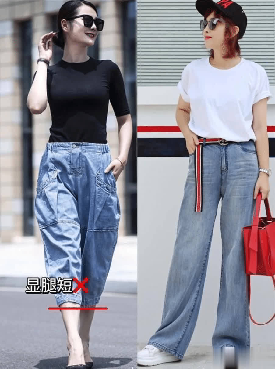 胯宽腿粗、腿不直的女性选择直筒或阔腿裤,裤宽与胯部和大腿相近,不要过宽;
