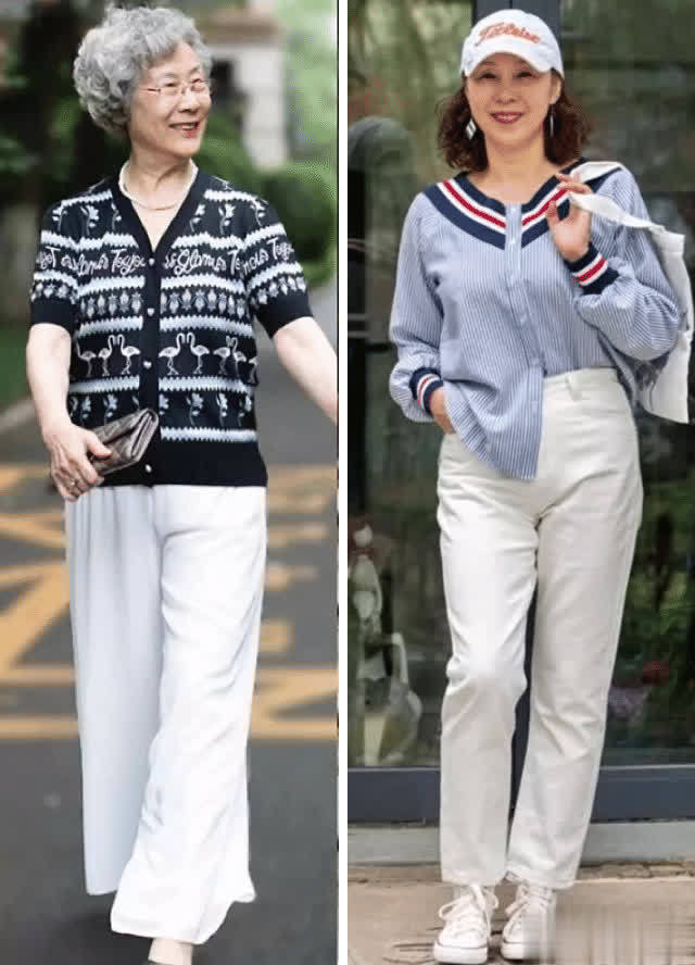 而且,对于很多深色服装以及设计比较花哨的,搭配一条白裤子,可以让穿着看上去没有那么老气。