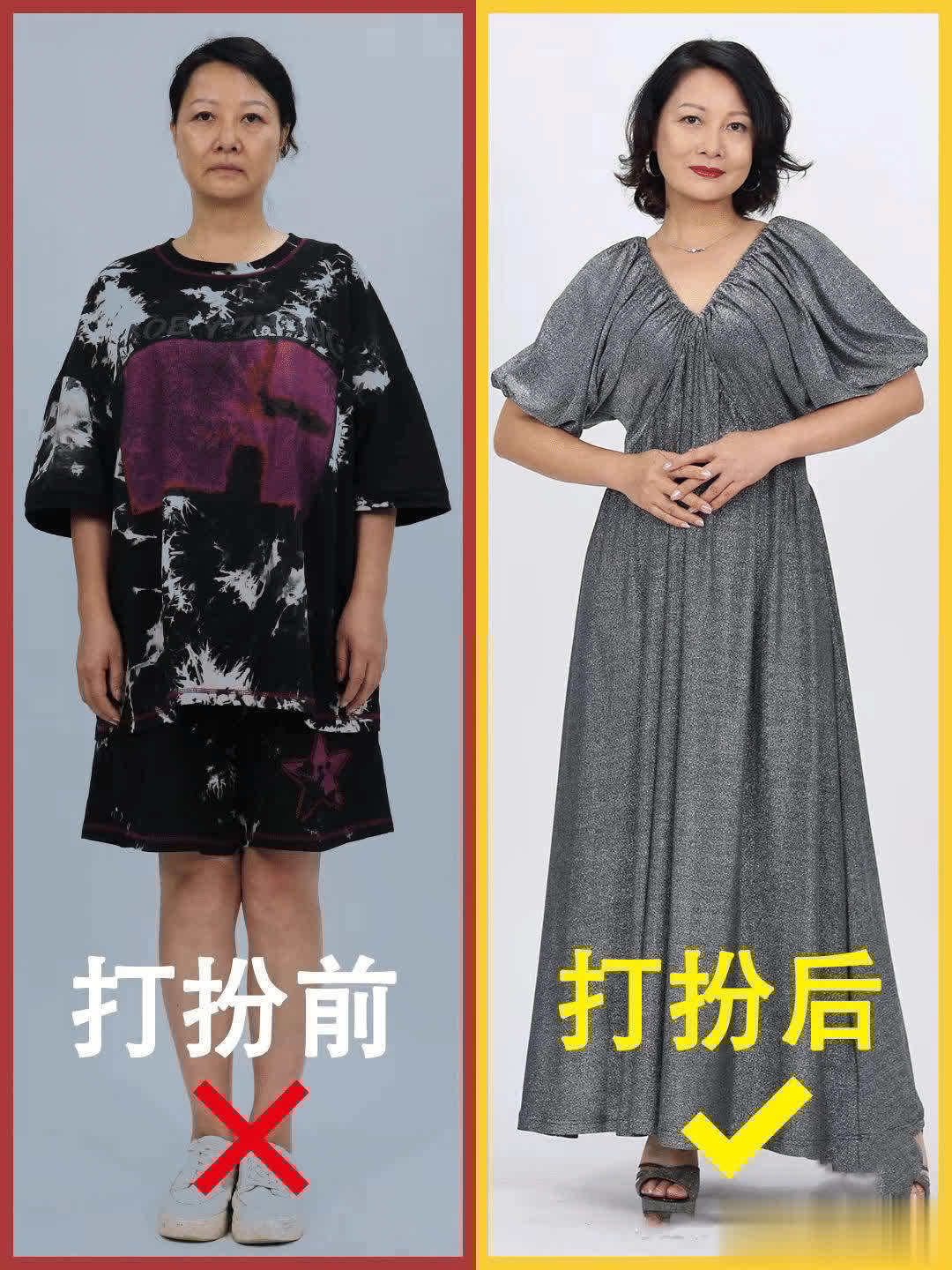 比如这位中年妈妈,宽松肥大的T恤裙显得整个人很臃肿肥大,而换了略微收腰且有腰线的裙子后,整个身形肉眼可以看出小了很多。