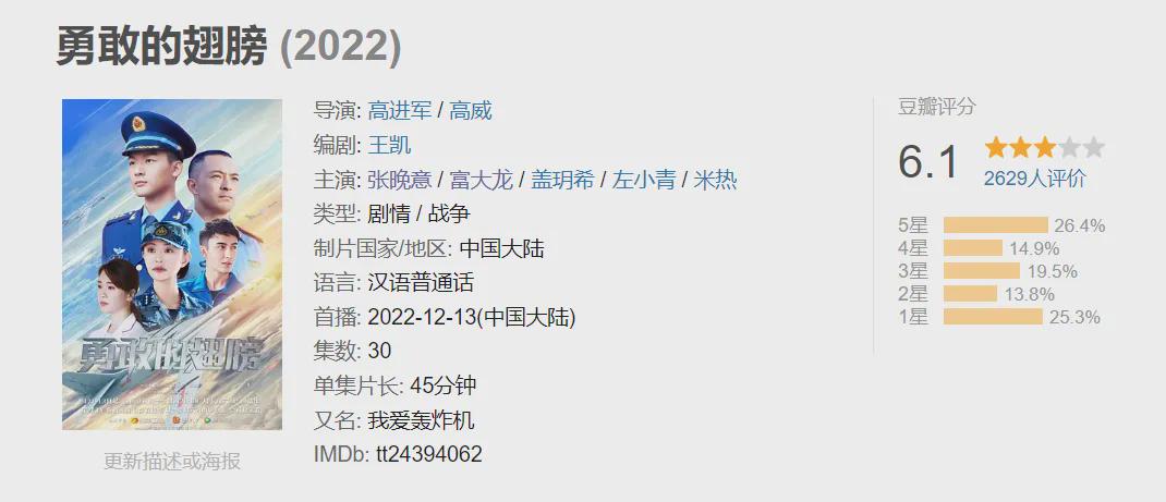 《勇敢的翅膀》里出现,搭档张晚意,该剧评分6.1分。