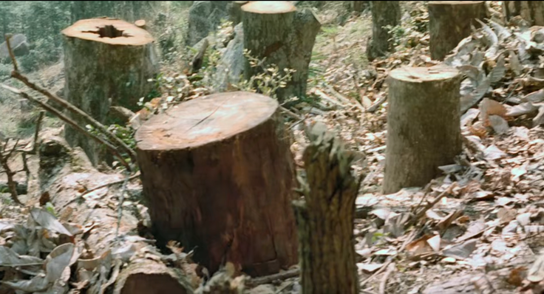当李天狗在巡逻时高兴地转着,却猛然发现,树林内却被砍伐一空。