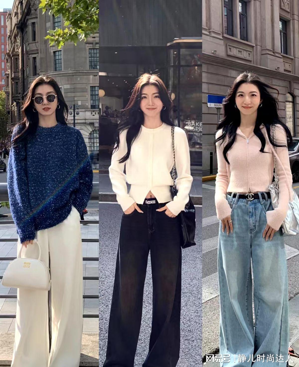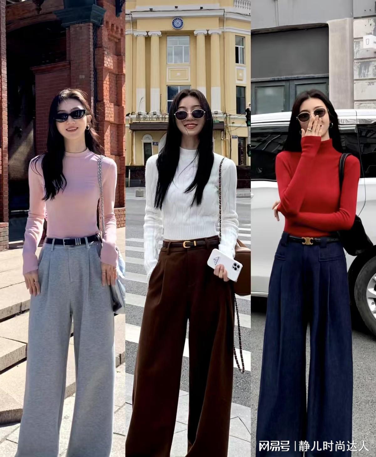 但在这里,会建议大家尝试利用修身的内搭和宽大一点的裤子的搭配,这是一种从视觉中产生对比的穿衣方案,更能显得上半身的曲线纤细一些。