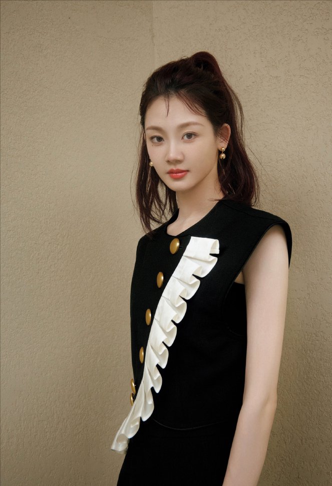 另外扣子的颜色也很抢眼,和她耳朵上佩戴的耳环颜色一致,搭配了高马尾,看起来更加元气满满,也能够迅速吸引眼球,为造型增添亮点。