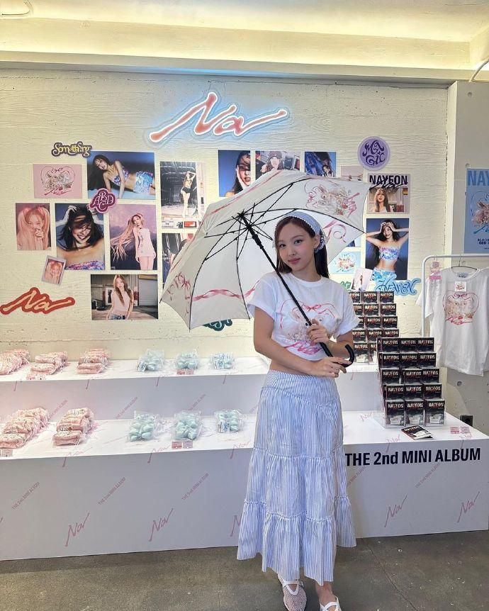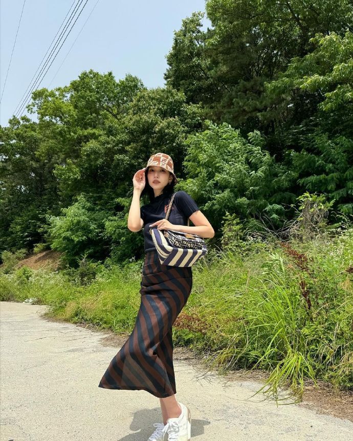 如果说你不想要穿吊带长裙或者挂脖长裙,可以直接选长款半身裙!韩国爱豆Mina名井南身穿蓝色T恤,搭配长款半身裙,脚踩小白鞋,时髦又百搭!
