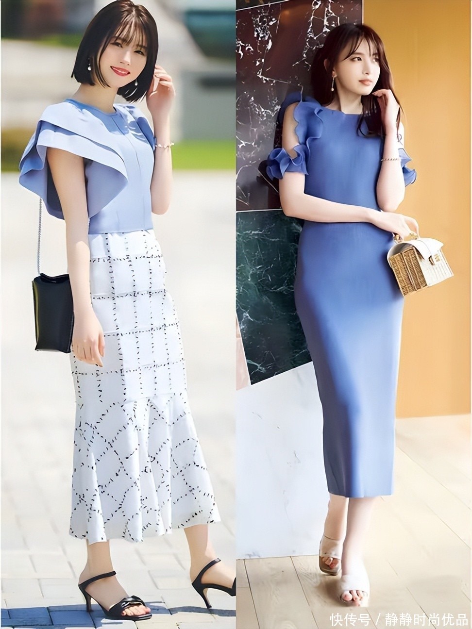 可以看到像这种半身裙和连衣裙都属于过膝盖不过踝的长度,并且裙摆向内收缩,可以更好地勾勒出整体的曲线感。