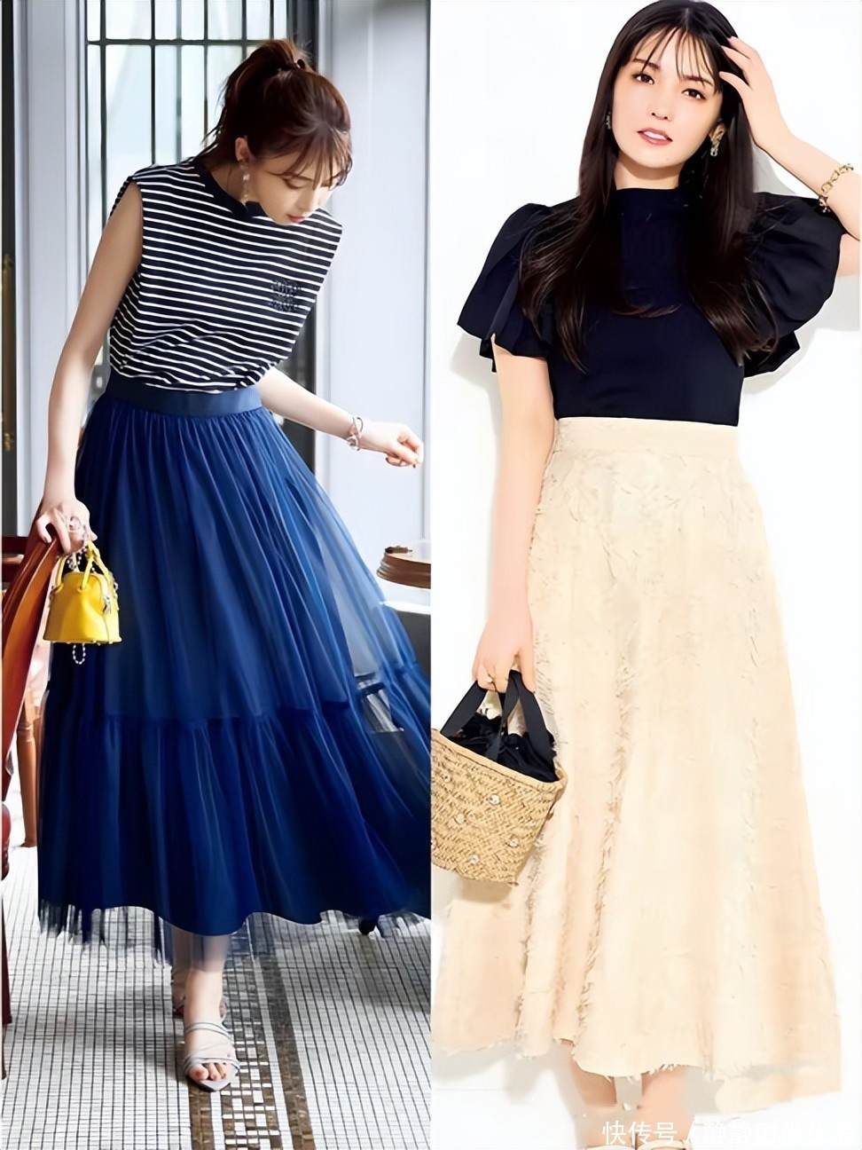 我们在选择裙子的时候就可以控制在小腿到脚踝这个区间,这样的长裙穿起来既没有压低个子的问题,也可以穿得得体和优雅,配着高跟鞋真的很时尚。