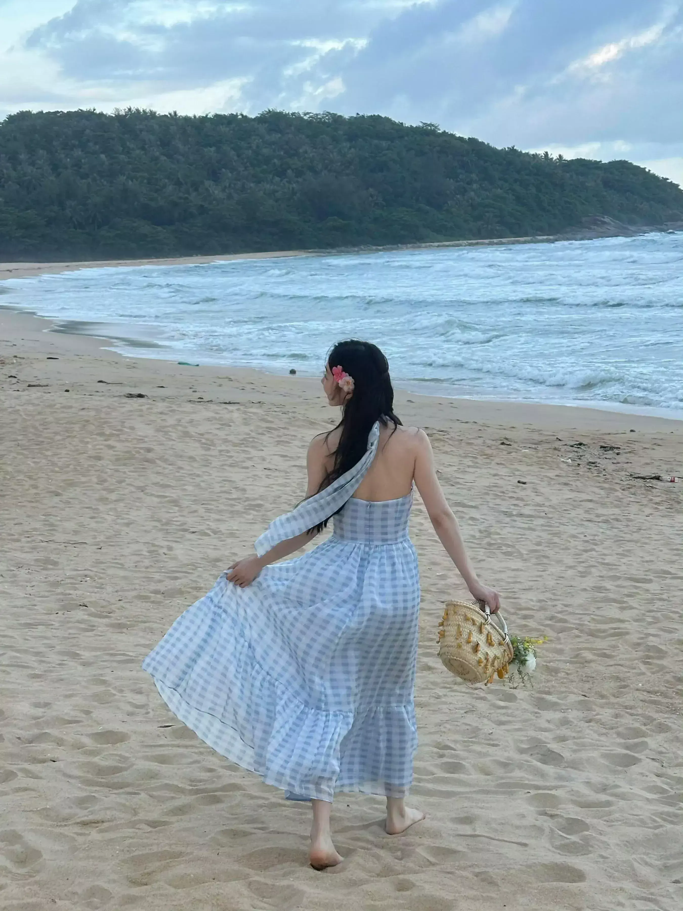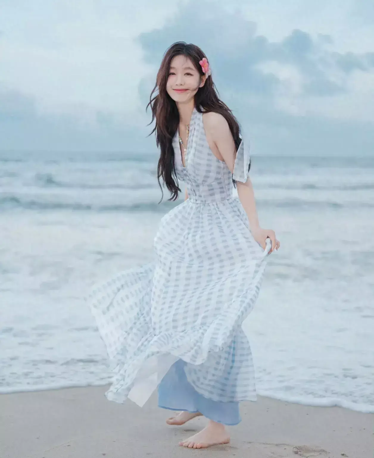 从外貌上大家就可以看得出来,徐梦洁在穿搭上还是非常偏向于一些甜美造型的。比如在海边的穿搭,一袭粉蓝色长裙鬓边带花,氛围感满满!