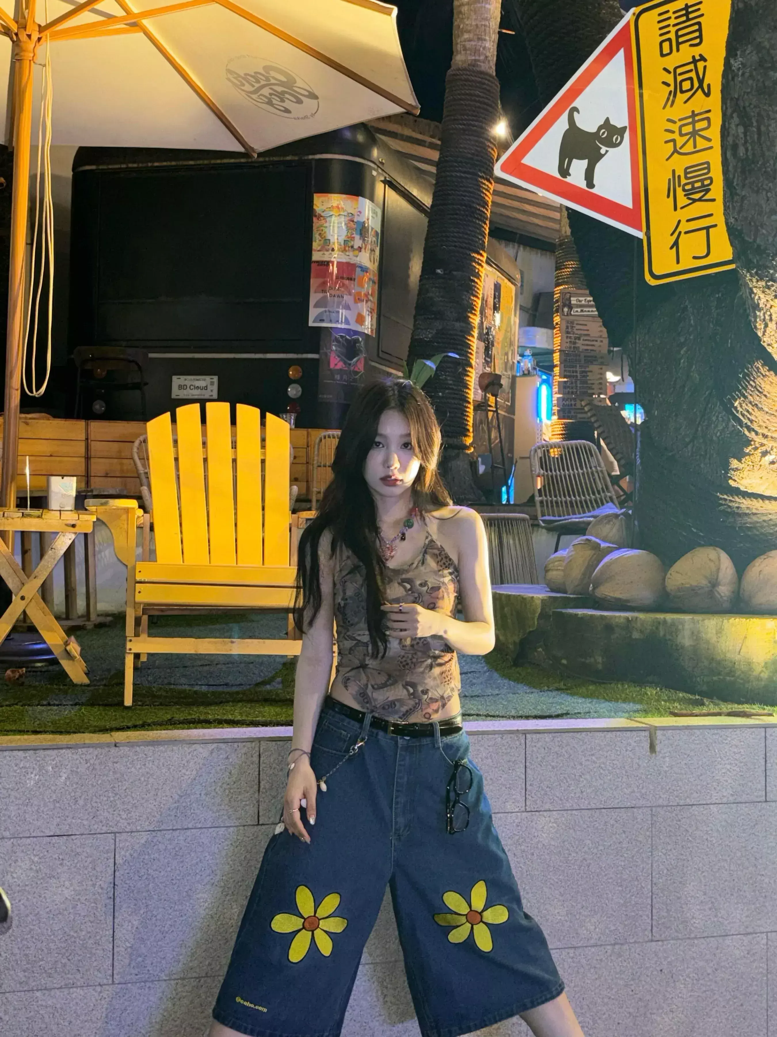 美式辣妹风一般都是选择漂亮的小背心,让腰身曲线更显妖娆,徐梦洁搭配了小花装饰的牛仔短裤!搭配彩色的串珠项链,让她在酷辣中尽显甜美。