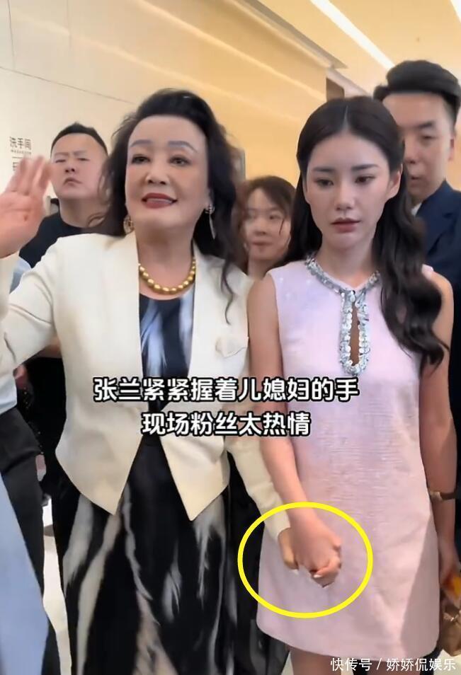 张兰当天打扮大气又富态,白色短款西装搭配黑白裙子职业范儿十足,脖子上超大颗粒的金链子更是分外夺目。马筱梅则身穿粉色的背心裙走在张兰旁边,不过和张兰不断和大家挥手打招呼相比,马筱梅显得有些拘谨。
