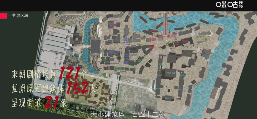 搭建了8万平方米的场景,复原了原画里的152个建筑,以及河道、桥梁和船只等。