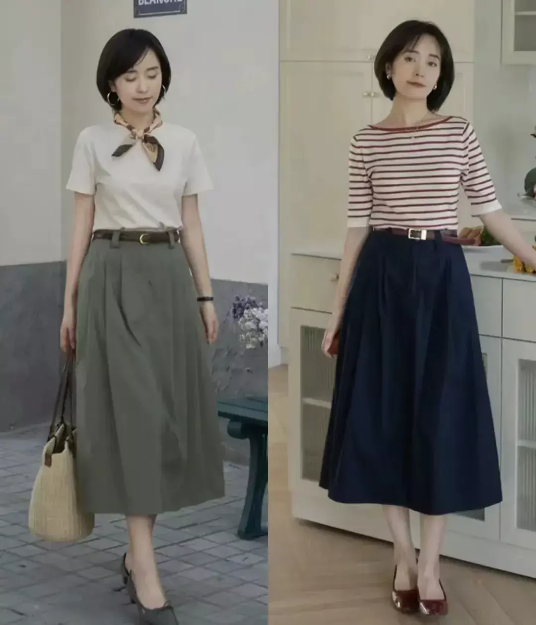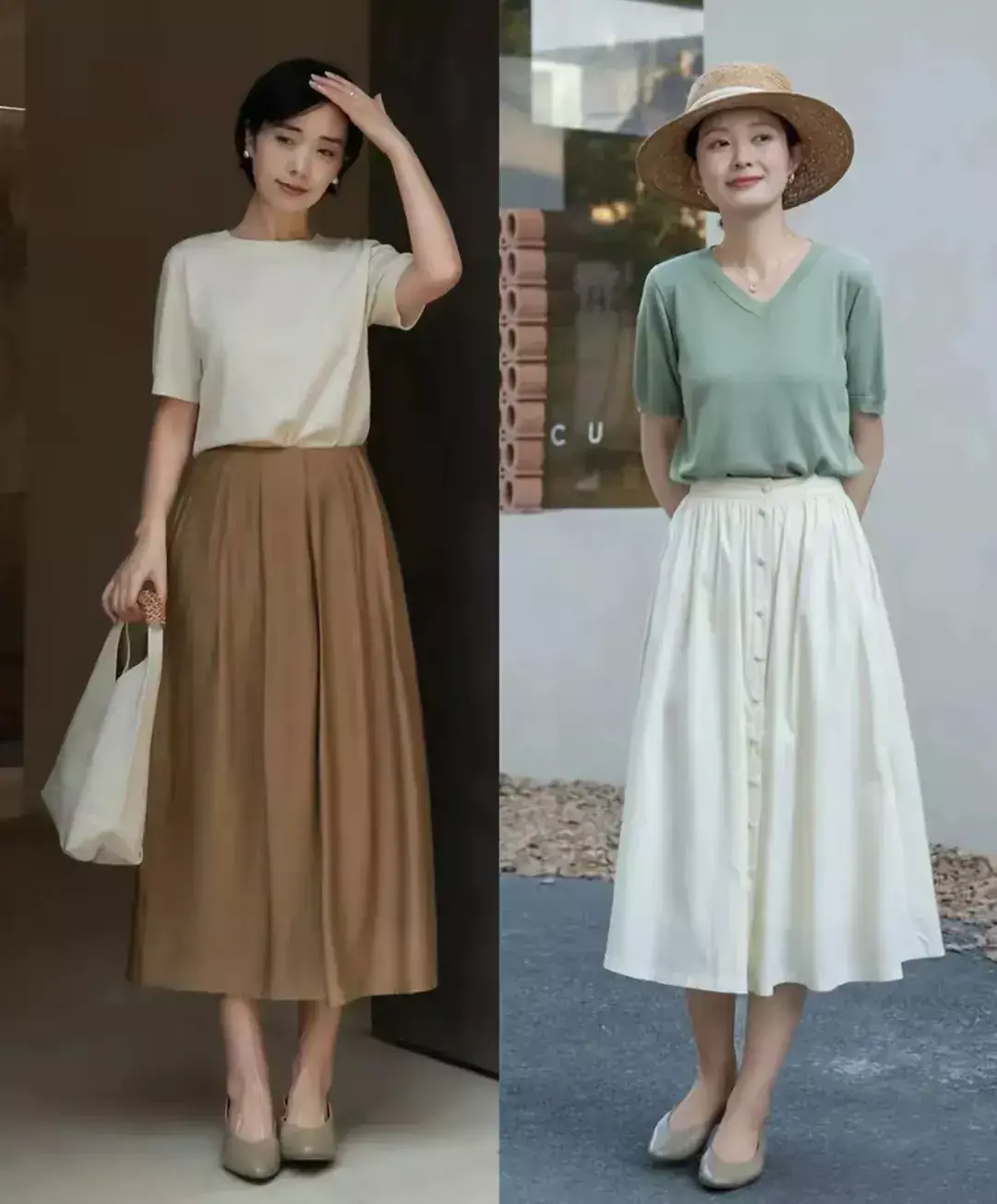⑤、米白色短袖搭配卡其色伞状半身裙