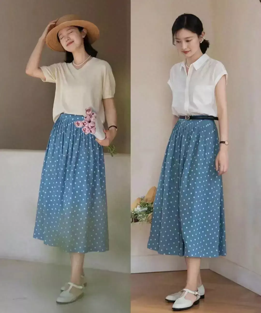 例如下面这一件白色的短袖衬衫搭配上碎花的半身裙,使得穿搭者的肤色,一样显得很白净。