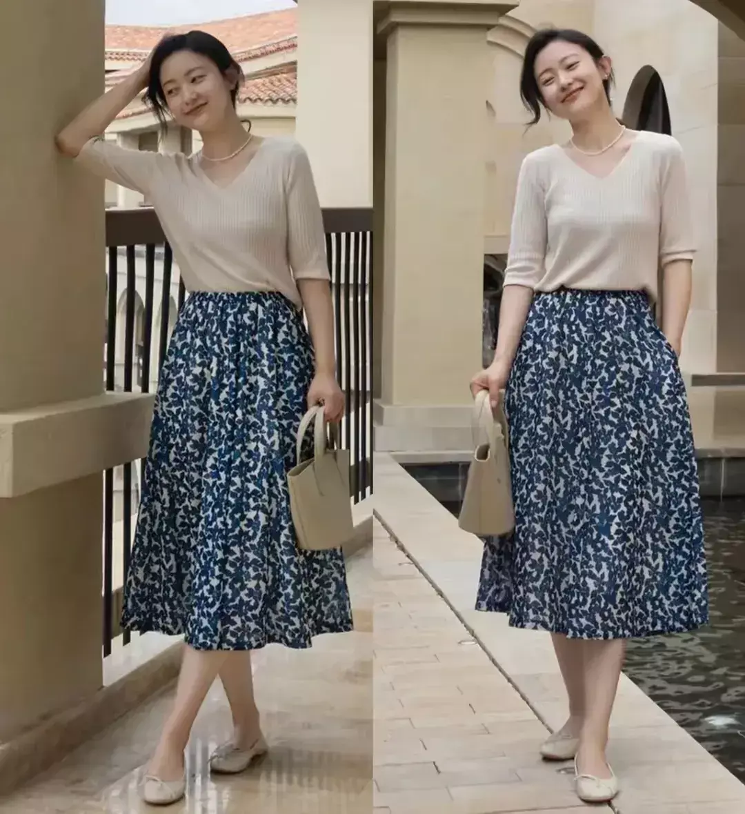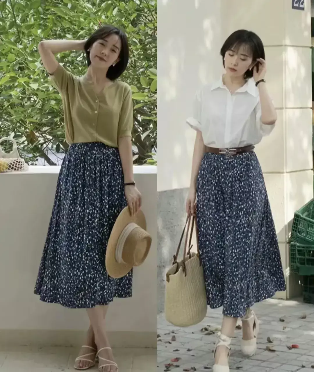 当然,我们还可以选择碎花的半身裙,放在下半身,这样我们的视觉中心就往下移,看上去整套穿衣打扮就不会显得过于凌乱,上半身可以像博主一样搭配上一件杏色的短袖,精致大气,又有女性的温柔感,很迷人。