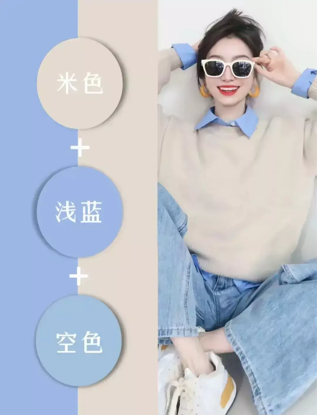 如果你觉得穿衣配色单调的情况下,还可以用叠加的穿搭方法,例如下面就用了米色的针织上衣叠加一件浅蓝色的衬衫和一条浅蓝色的牛仔裤,让整个穿搭造型层次感分明。