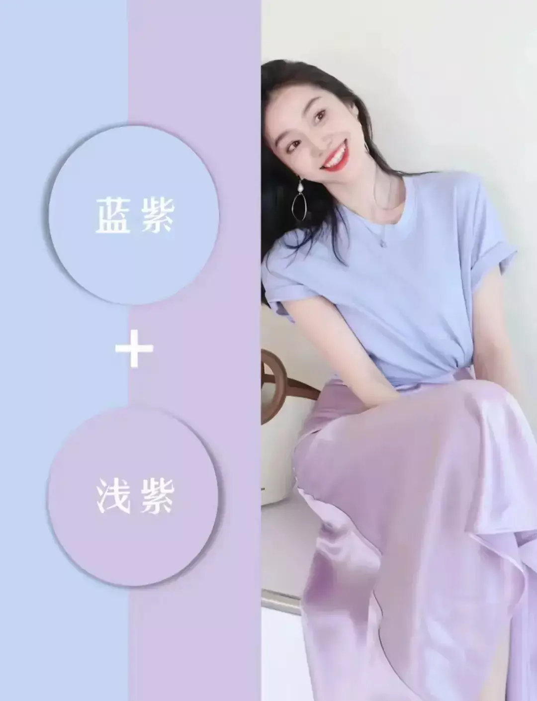 紫色的一副单品最迷人,有一种神秘感,例如下面这一套穿搭示范男子的短袖上衣,搭配上浅紫的半身裙,出女性的优雅又很漂亮。