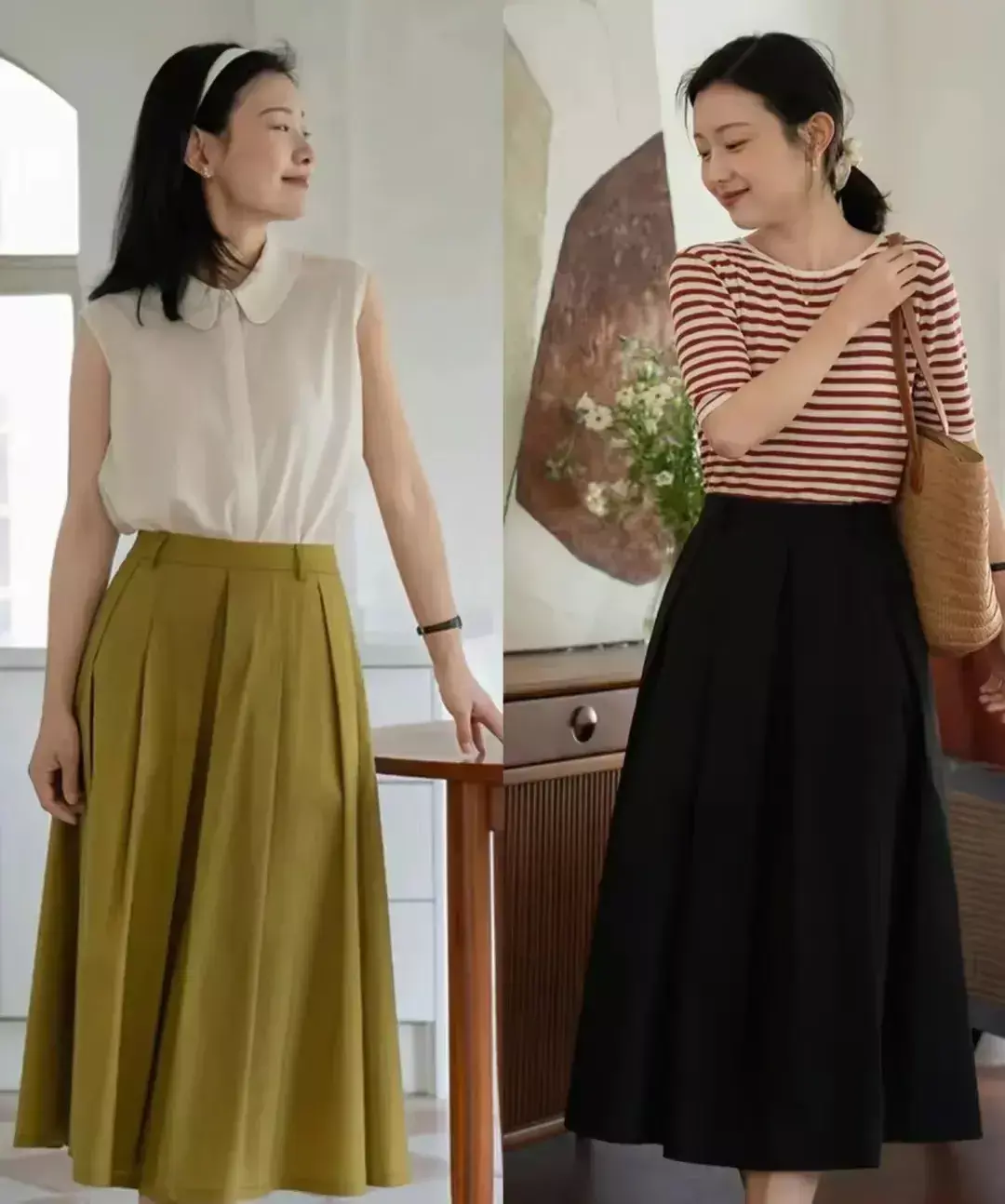 例如下面这一件白色的衬衫上衣搭配上黄色的散装半身裙,穿起来就显得很有气质感。感觉显得过于单调的情况下,我们还可以选择条纹的圆领上衣,搭配上黑色的散装半身裙,这样会显得更洋气。