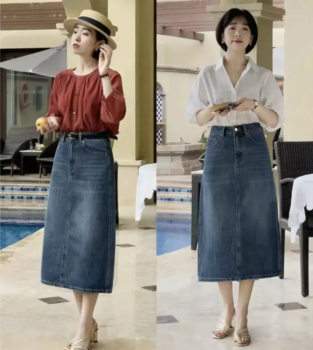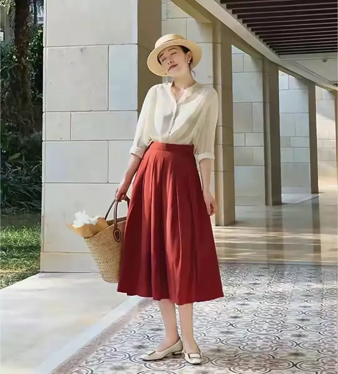 我是30岁左右的职场女性,想要整个穿衣造型复古洋气的情况下,可以像下面这位博主一样选择棕红色的衬衫上衣,搭配上蓝色的牛仔半身裙,头戴一款草帽,氛围感直接拉满,复古又洋气。