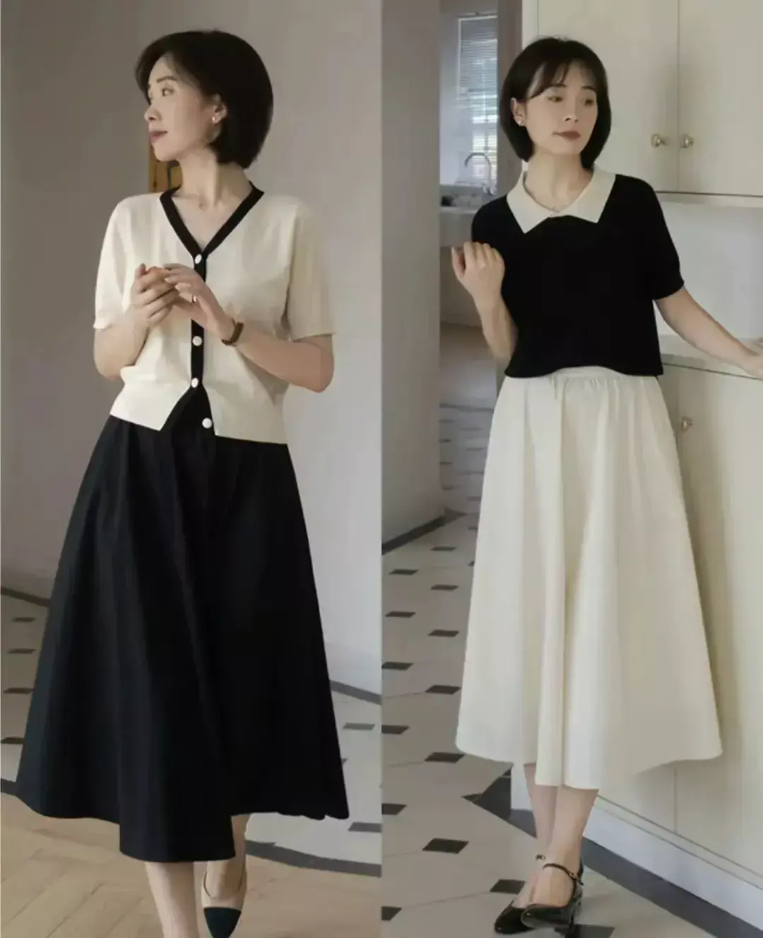 当然,如果你选择的是白色的衣服单品,尽量选择米白色,例如下面这一件针织开衫和半身裙都不是属于纯白的米白色,看起来更柔和。搭配上黑色的裙子或者是上衣才会更耐看,更显气质。
