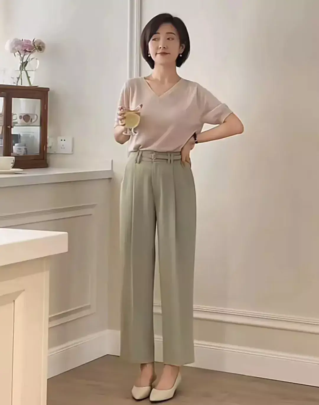 如果你是40岁左右的中年女性的话,还非常推荐你选择下面这位博主的这套穿衣配色,用裸粉色的针织短袖搭配上芥末黄的西裤和一双米白色的粗跟单鞋进行组合搭配,轻轻松松穿出显贵而且减龄的视觉效果。