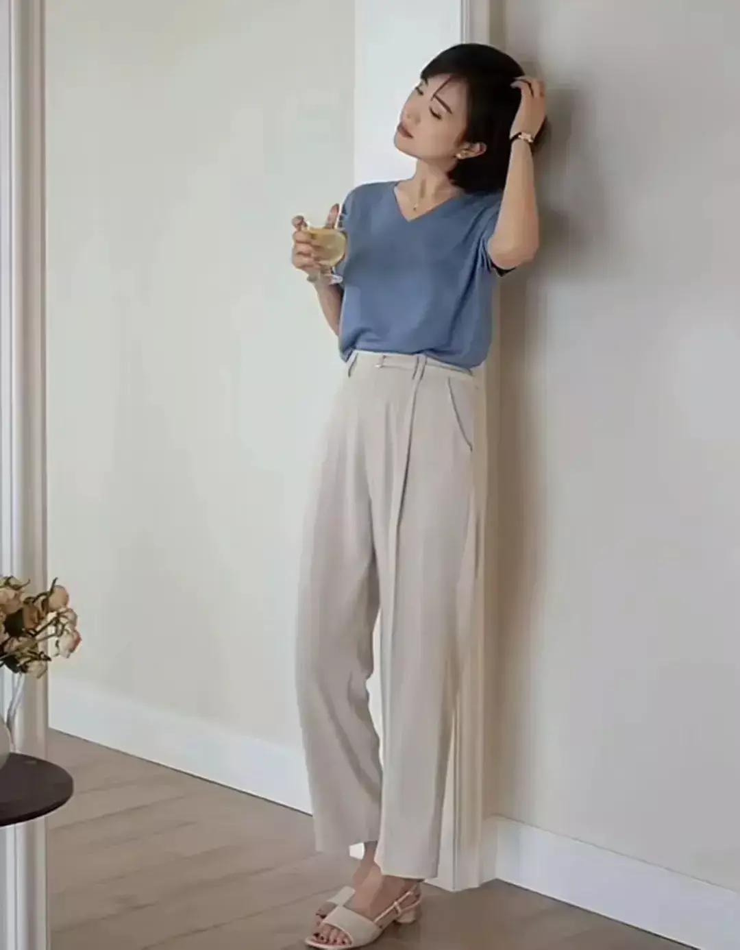 为了降低颜色的出错率,我们可以把穿搭的鞋子颜色和裤子的颜色是同色系的,例如下面这位博主选择的是杏色的西裤,脚踩的凉鞋也是杏色的,色系搭配显得更清爽。