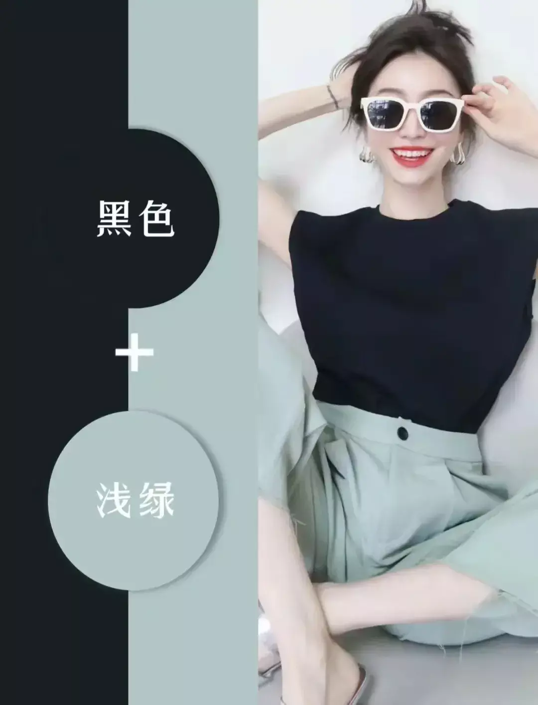 黑色的衣服给人的感觉就是最为基础的单品,上身之后可能会显得沉闷,但是博主用了浅绿色的西裤和无袖的黑色上衣,形成了一个撞色的效果,层次感分明,而且也很有活力。