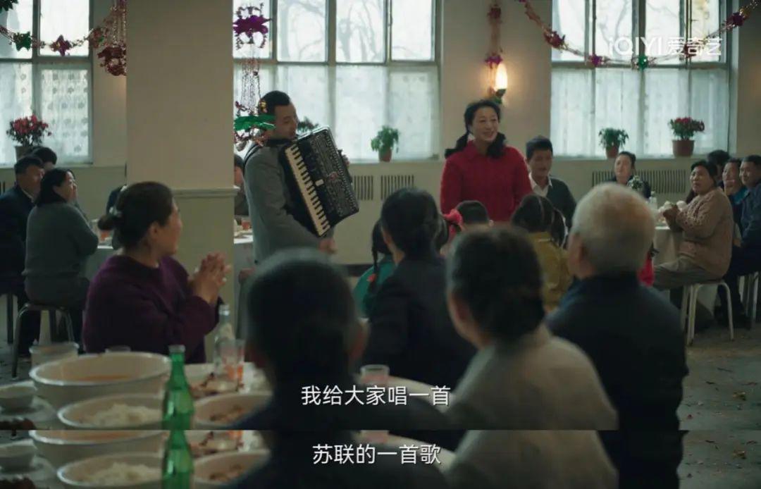 △《平原上的摩西》里庄德增与傅东心结婚时,女方家属演唱了一首前苏联的文艺歌曲《灯光》。(图源/《平原上的摩西》)