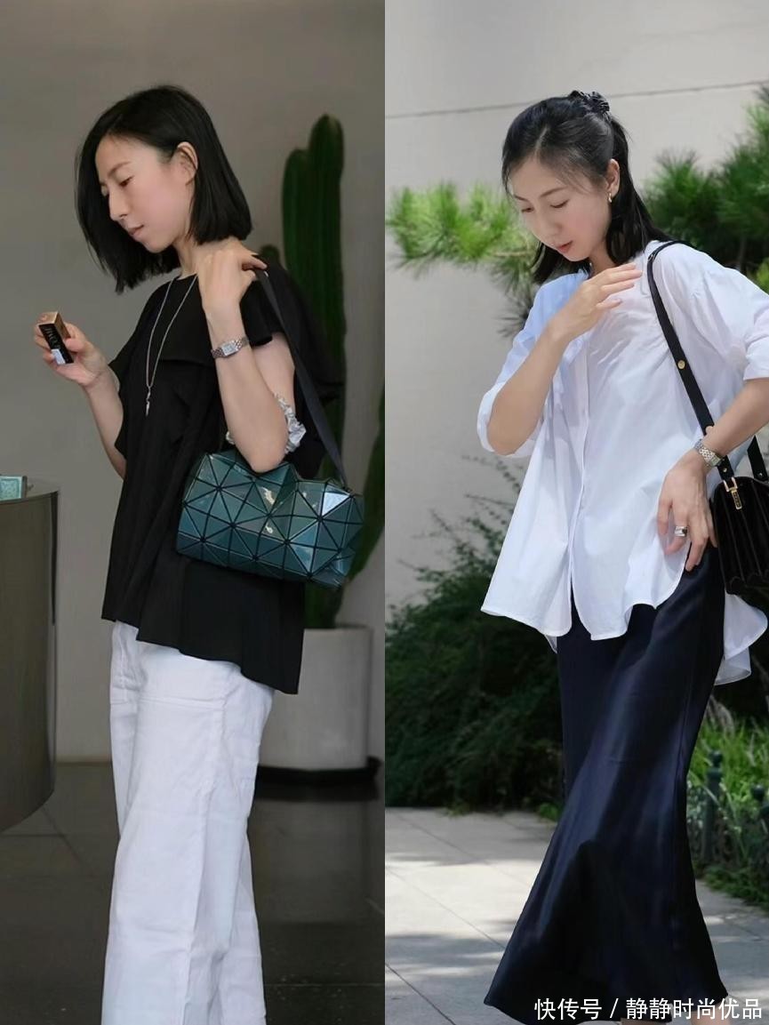 黑白的纯色单品组合在一起能起到一种风格上的综合效果,白色代表的是清新温柔,黑色代表的是沉稳霸气,这两种气质都可以在中年女人身上营造。