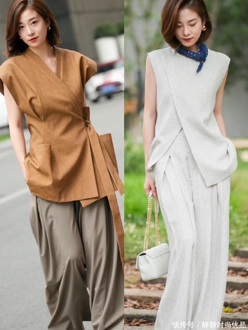 这是许多女人偏爱爱直筒上衣来搭配小脚裤的原因,小脚裤有点像西装裤,整体的版型会更加贴合腿型线条,因此垂感不会过强,但整体的风格十分板正,适合参加正式场合。