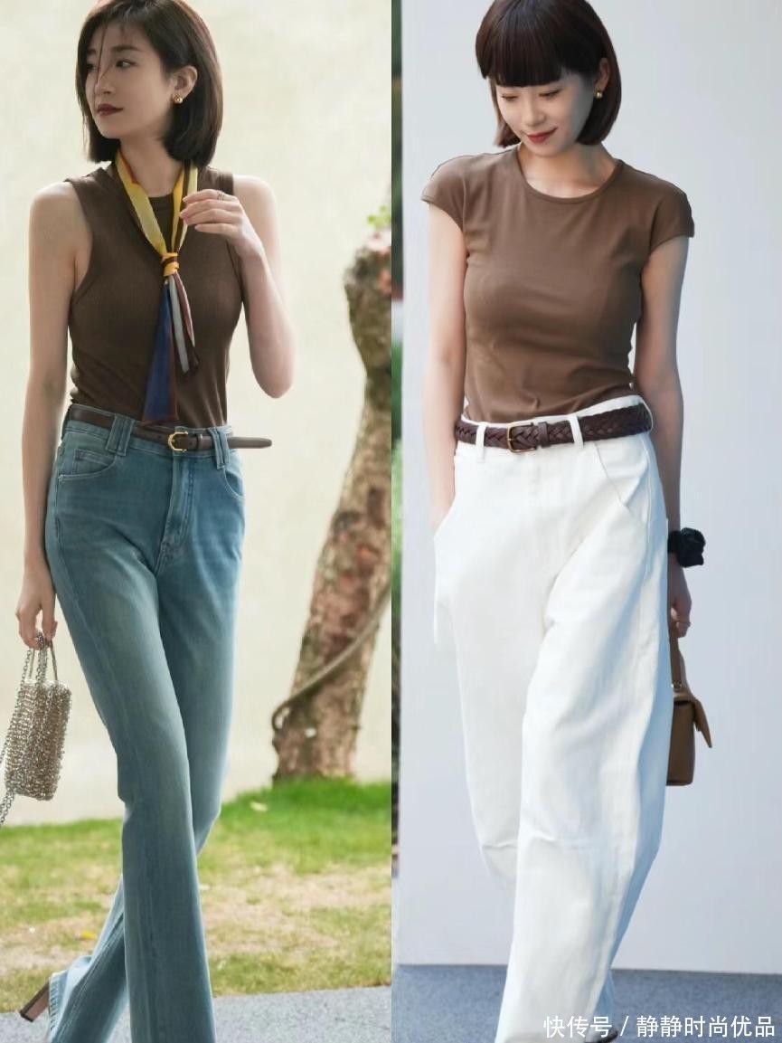首先颜色尽量选择咖色这样的深色调,看起来会更加沉稳,与中年女性的气质更加吻合,同时款式也要偏修身一点,过于宽大的T恤看起来会有些邋遢。