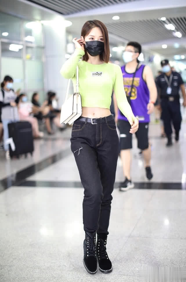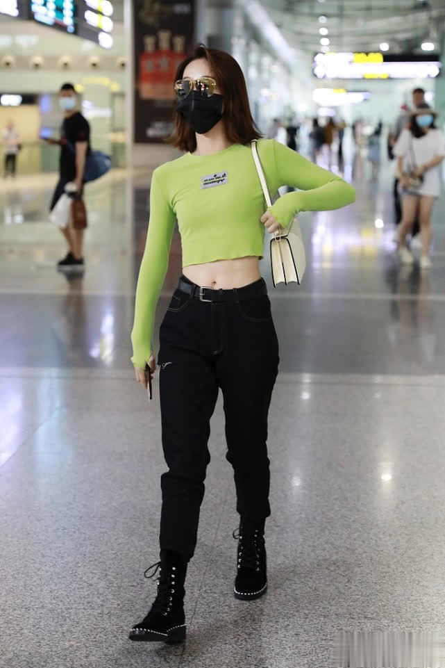 一件绿色的修身短款上衣+黑色低腰长裤,色彩上并没有太多的违和感,也不会过于的张扬,所以穿搭上就很有层次感,中间的露腰形式也很有辣妹风,夏季穿正合适,所以蓝盈莹真懂释放自己的优势,穿短款上衣显出三七比例,腿看着挺长。