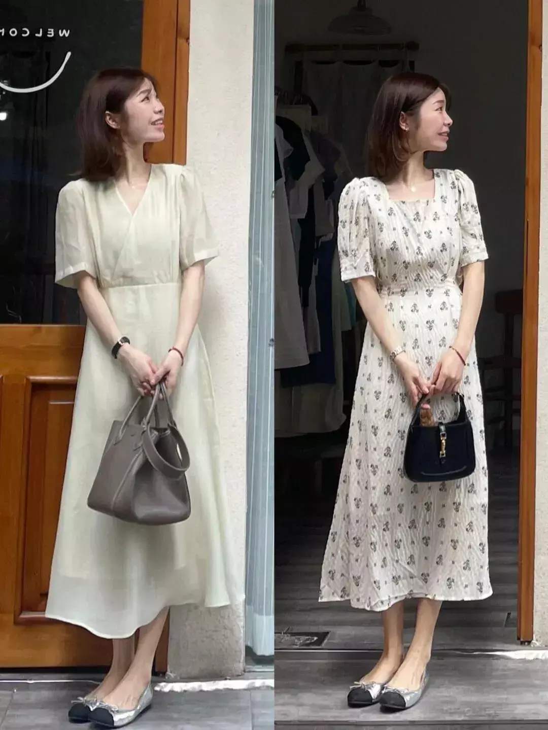 例如,博主身上穿搭的这种米色的V领连衣裙,拉长颈部线条的同时有足够的温婉端庄,采用收腰长裙的剪裁设计,将轻熟女性的端庄和稳重呈现出来,素雅大方,也不会感觉老气。