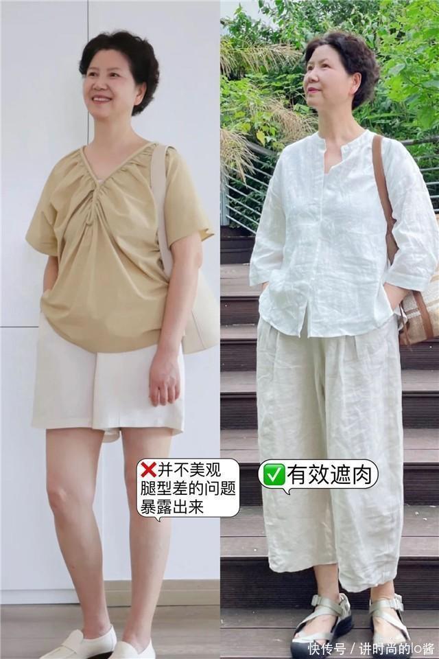 而短裤对于五六十岁的女性来说,是需要规避的一个雷区,短裤虽然可以满足清凉感的需求,却容易有刻意扮嫩的嫌疑,会显得很不得体。同时短裤的长度太短,大幅度的露出了腿部的肌肤,对于腿型有缺陷的女性来说也会暴露腿型上的短板。