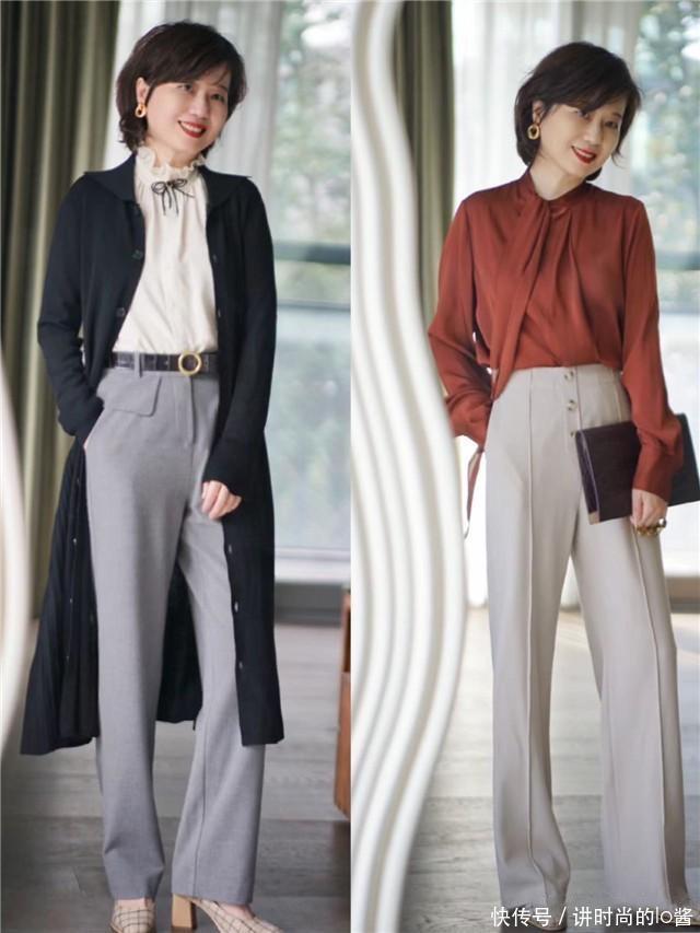 但如果想要打造出更加高级知性的风格,那不妨尝试一下西装裤。西装裤的质感十分的顺滑,而五六十岁的女性在挑选时要注意多尝试加入了“中缝设计”,且裤腿线条感强的直筒宽松版型,既能够遮盖住腿上的赘肉,又可以加强立体感,更加的利落显瘦。