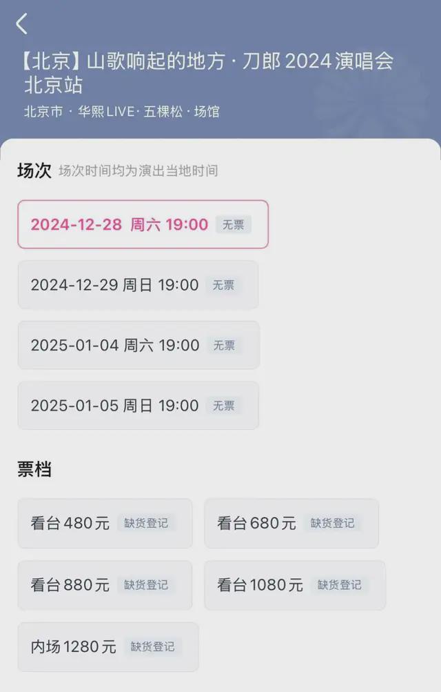 结果还是没买着。战况过于激烈,刚开票的瞬间,“缺货登记”几个字就冒了出来。光看定价,刀郎北京演唱会的票面价格从480元到1280元,并不算高。作为对比,刘德华今年7月在同一场馆开的演唱会,看台票最低为680元,内场票最高达到了2580元。但很少有人原价抢到。票务二级市场摩天轮上,刀郎北京场的看台票一度被炒到近5万元一张。
