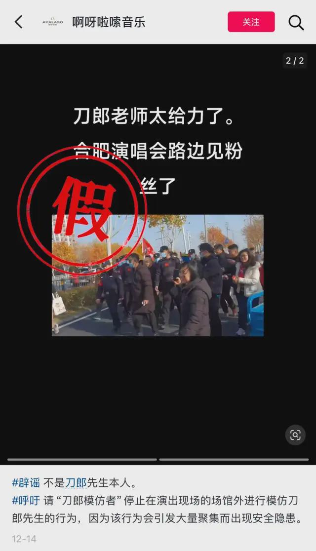 早在几天前,主办方就发过倡议书,号召歌迷不要在演出场馆附近聚集、逗留。原因是此前在厦门,就出现过“场内3.8万人,场外12.8万人”的盛况。到了合肥,不少网友发帖说遇到了“刀郎”,他还亲切地与歌迷互动、合影,引得刀郎经纪公司紧急辟谣说“不是本人”,并呼吁模仿者停止这些行为。