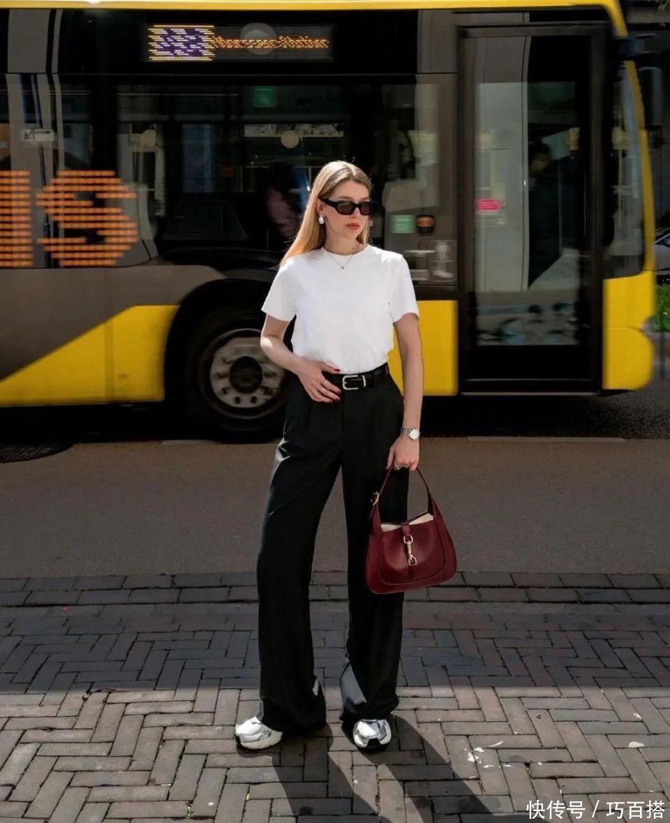 第二,选择白色正肩T恤时,搭配深色系高腰拖地西装裤更合理,松紧度和配色双重加持,高级感加倍!
