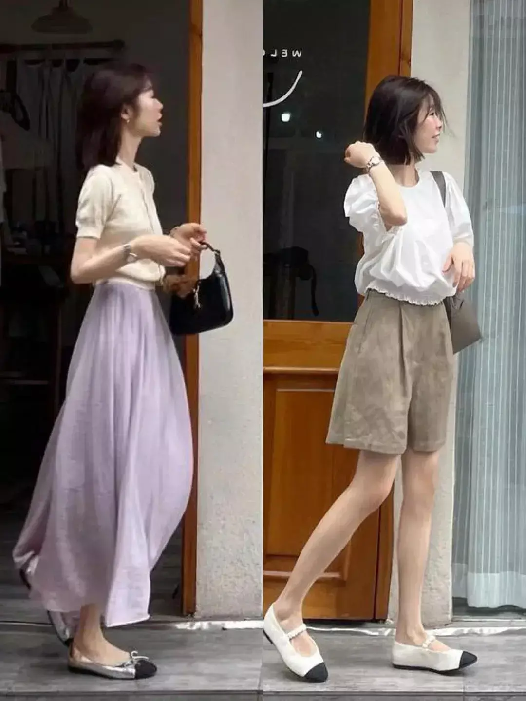例如博主身上的这种双层小飞袖的上衣,再结合上一点荷叶边的元素之后,可以说是将小女生的清新俏皮展现的淋漓尽致,搭配黑色长裤,乖巧温柔。