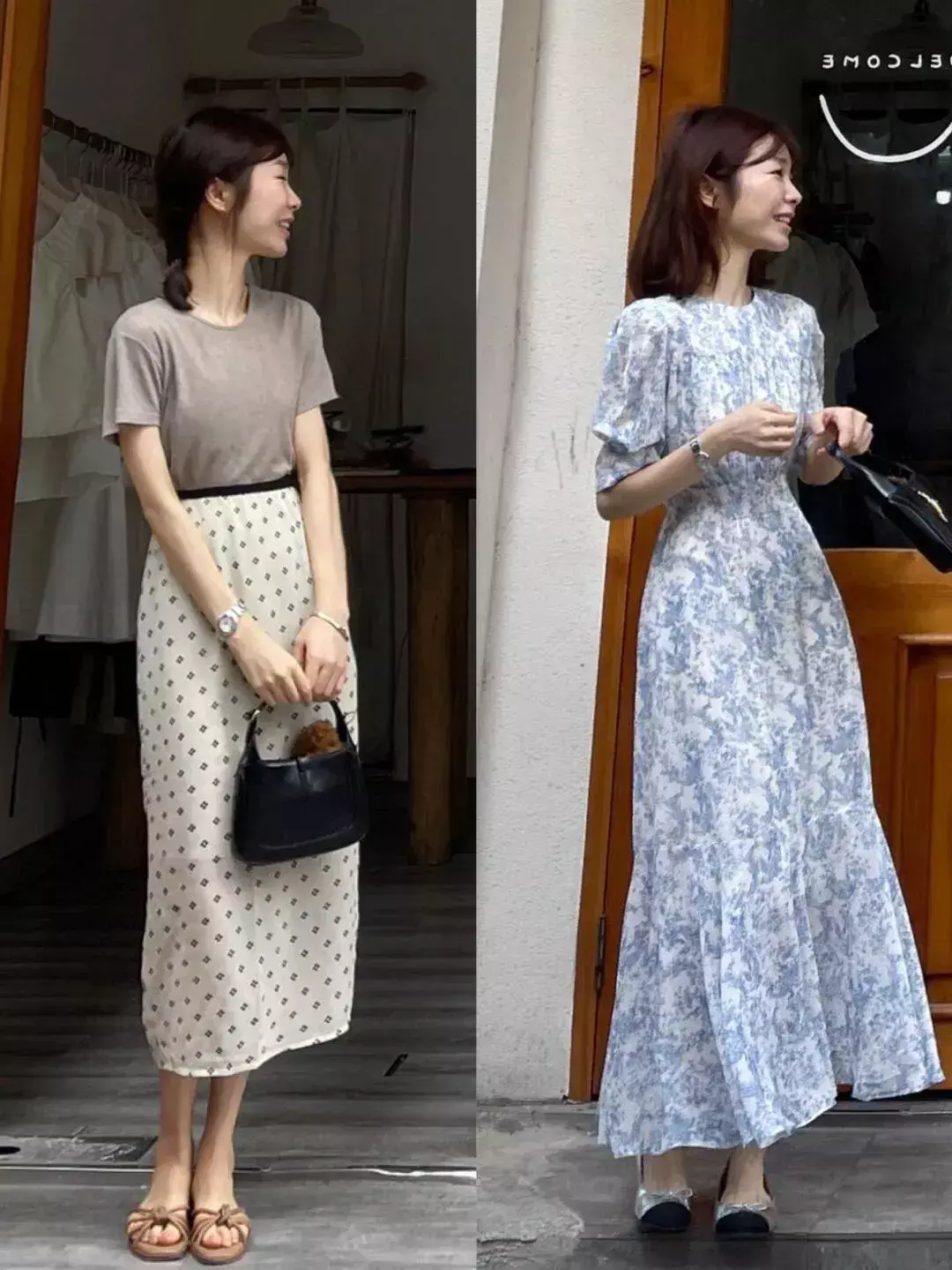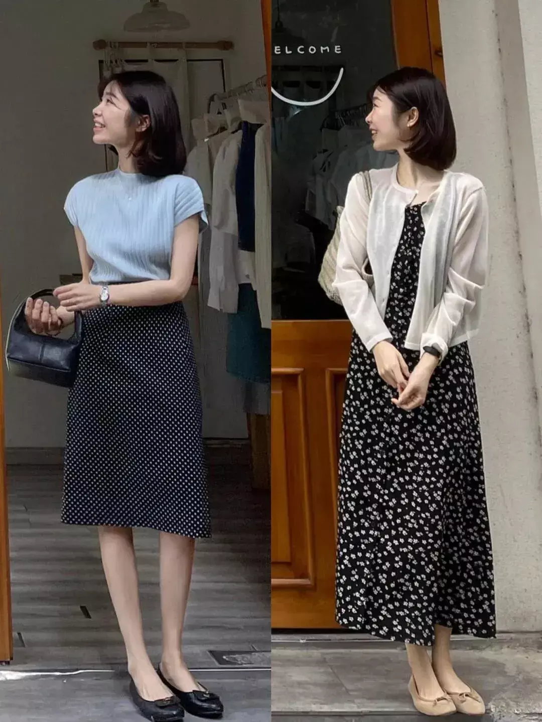 例如博主身上的这一条黑色波点裙,采用黑色相对来说更加稳重内敛一些,点缀上细腻的白色波点元素之后,既有视觉冲击力,又能打破单调枯燥,在搭配天蓝色的上衣之后,轻松的将轻熟女性的温婉优雅展现出来。