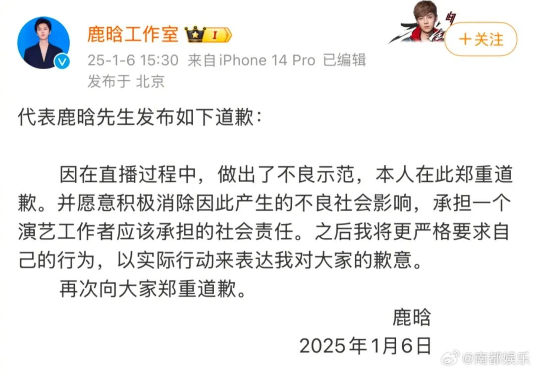 6日下午,鹿晗工作室就鹿晗社交平台被禁止关注作出回应:“代表鹿晗先生发布如下道歉:因在直播过程中,做出了不良示范,本人在此郑重道歉。并愿意积极消除因此产生的不良社会影响,承担一个演艺工作者应该承担的社会责任。之后我将更严格要求自己的行为,以实际行动来表达我对大家的歉意。再次向大家郑重道歉。”