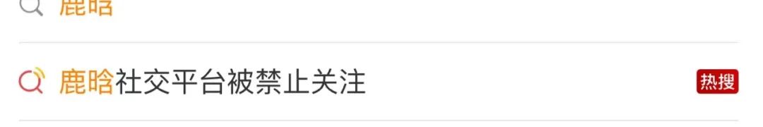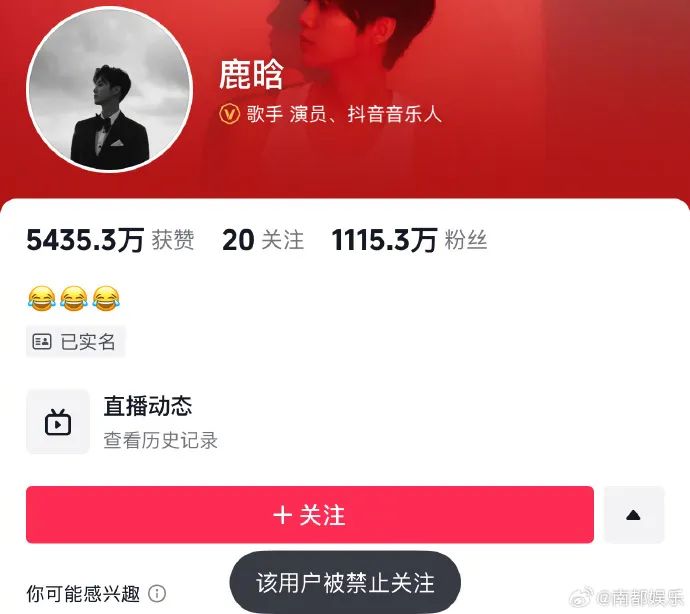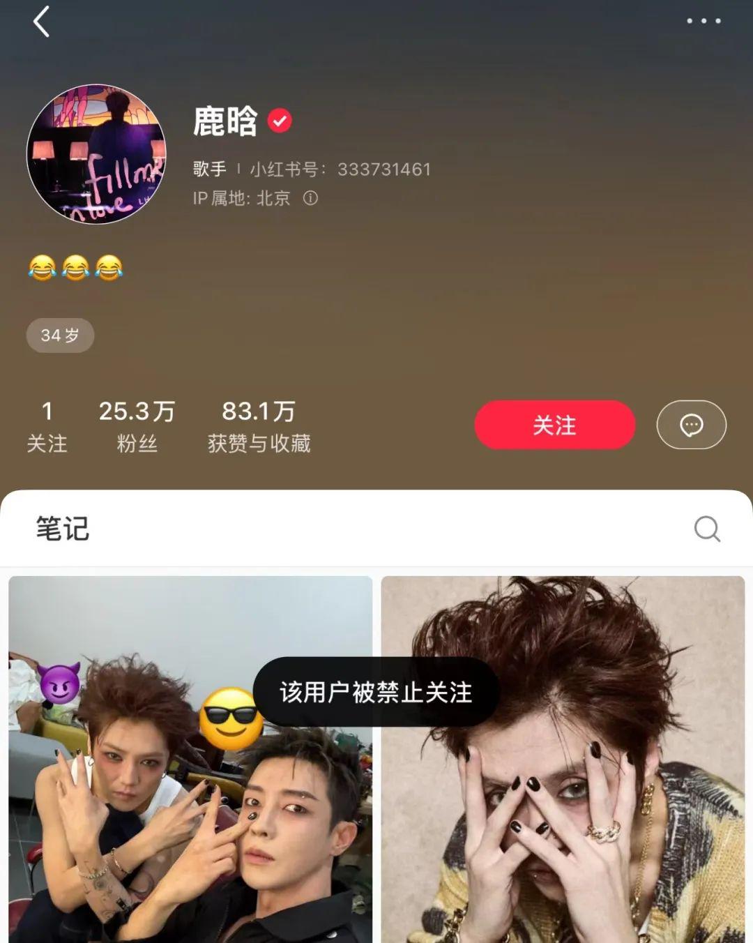 据悉,鹿晗在微博、抖音、小红书的社交账号显示被禁止关注的状态,微博显示提示“该用户因违反法律法规或《微博社区公约》被禁止关注!”。